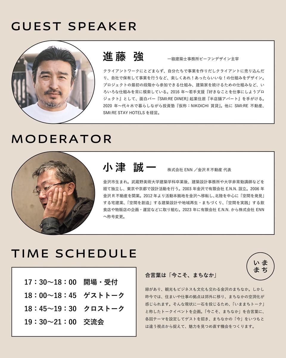 緑があり、観光もビジネスも文化も交わる金沢のまちなか。しかし昨今では、住まいや仕事の拠点は郊外に移り、まちなかの空洞化が感じられます。そんな現状に一石を投じるため、「いままちトーク」と称したトークイベントを企画。「今こそ、まちなか」を合言葉に、各回テーマを設定してゲストを招き、まちなかの“今”をいつもとは違う視点から捉えて、魅力を見つめ直す機会をつくります。